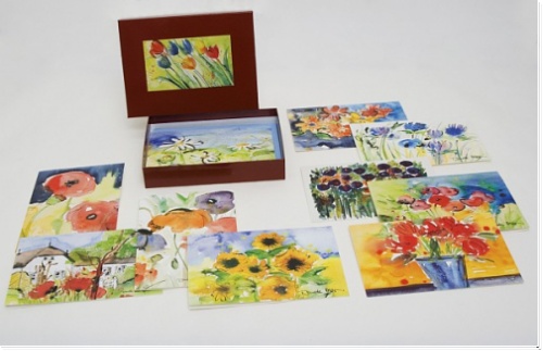 Roter Mohn, blaue Kornblumen, gelbe Sonnenblumen, Felder, Wiesen, Gärten und Blumenarrangements sind die Motive, die in dieser Box zu einem bunten Blumenreigen werden.